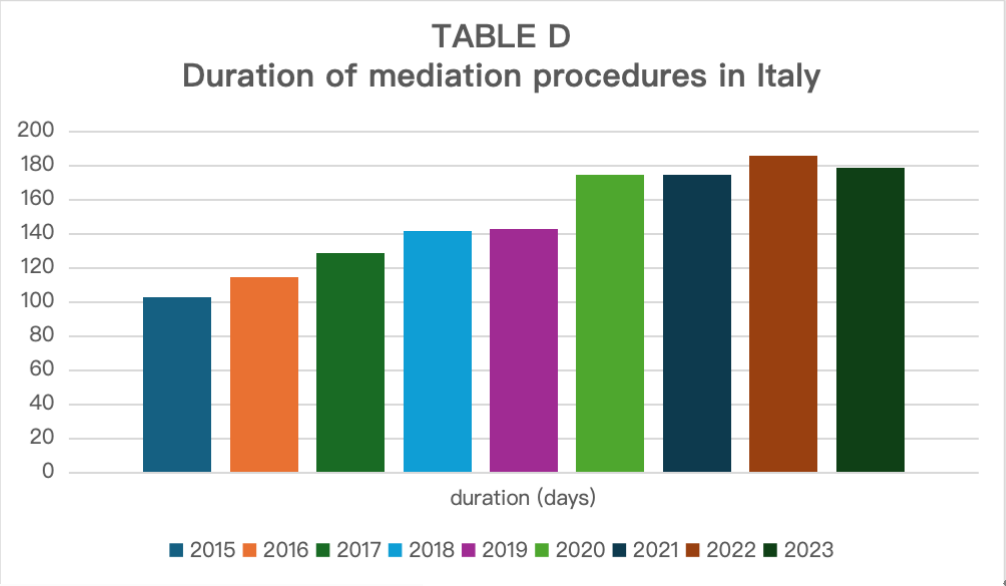 The duration of the mediation procedures in Italy has been in almost constant increase since 2015 (see Table D below).