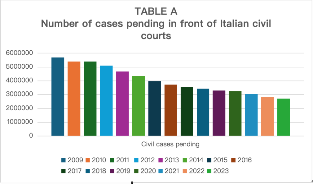 Year 2009 was the very year during which Italy experienced the highest number of cases pending in front of Italian civil courts: 5,700,105 (see Table A below).