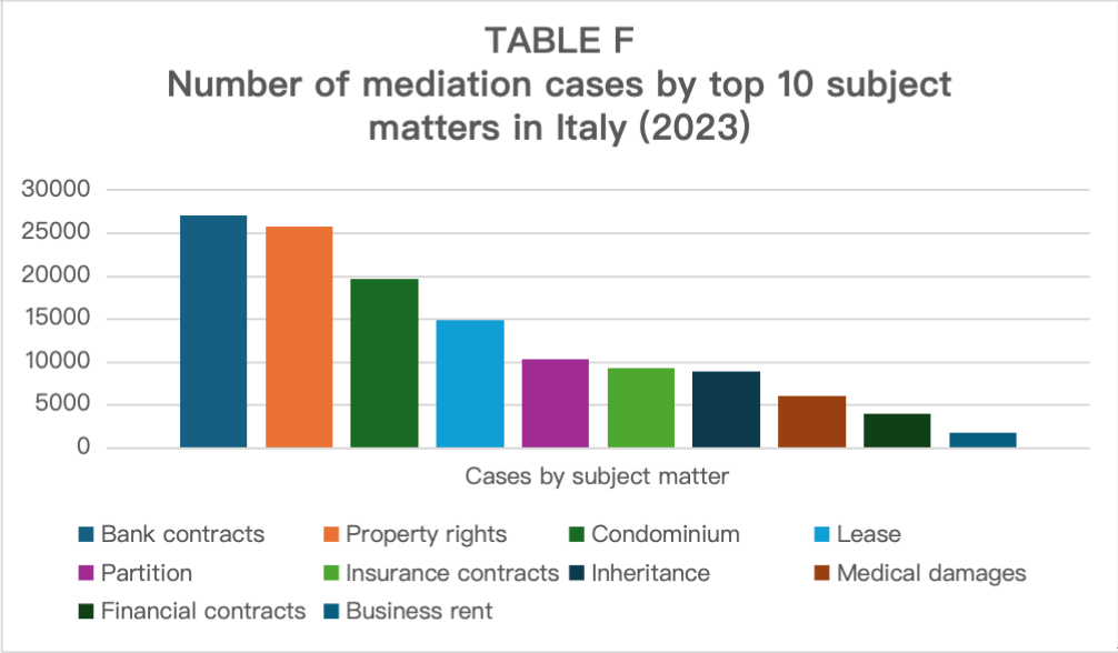 Table F describes the top 10 subject matters of mediation cases in Italy in 2023.