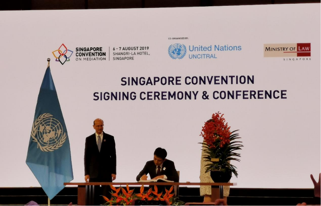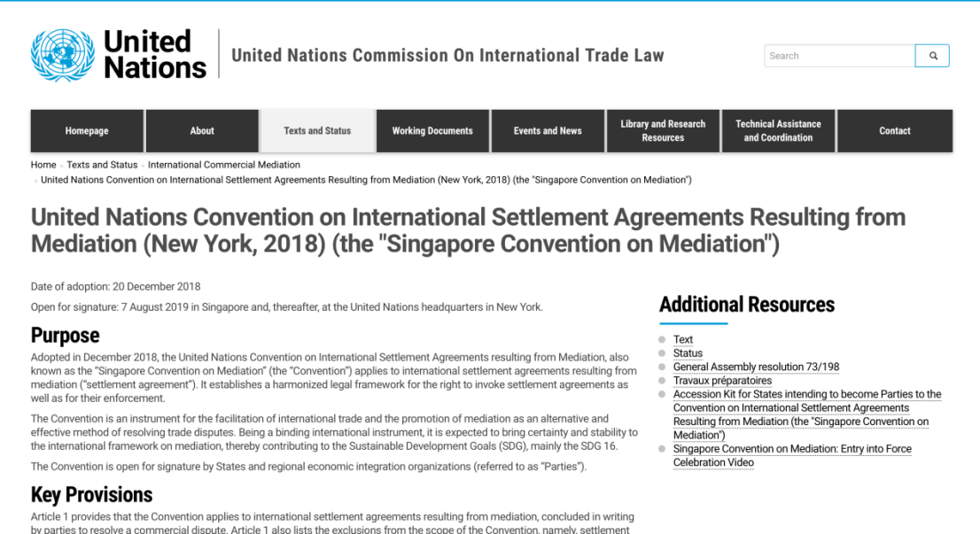 2018年6月27日联合国国际贸易法委员会第51届会议通过了《联合国关于调解所产生的国际和解协议公约》,《新加坡公约》是由联合国国际贸易法委员会历时四年研究拟订,旨在解决国际商事调解达成的和解协议的跨境执行问题。2018年12月20日第73届联合国大会通过《新加坡公约》,2019年8月7日包括中国在内的46个国家受权代表在新加坡签署了《新加坡公约》,因在新加坡开放签署,故又称《新加坡调解公约》。2020年9月12日《公约》生效。截止至今,包括中国、美国、印度、新加坡等在内的55个国家和地区签署了这一公约。