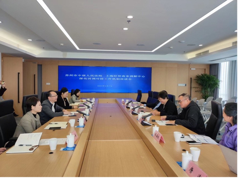 2023年4月7日,上海经贸商事调解中心(以下简称“调解中心”)受邀前往中国(江苏)自由贸易试验区苏州片区法律服务中心拜访苏州中级人民法院,走访了苏州国际商事法庭(以下简称“苏州国商法庭”)、苏州工业园区人民法院自由贸易区法庭(以下简称“苏州自贸区法庭”),受到了苏州中级人民法院杨恩乾副院长等领导的接待,双方就深化调解中心与苏州国商法庭诉调对接、探索调解中心与苏州自贸区法庭实现对接展开交流,为今后的合作打下进一步基础。