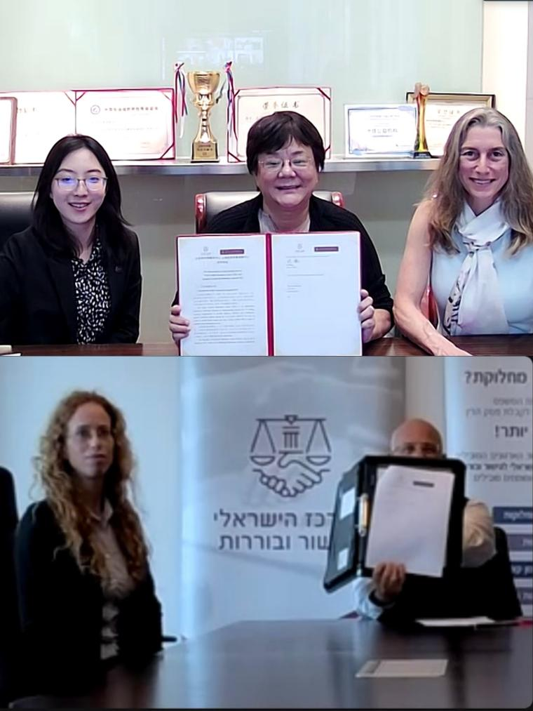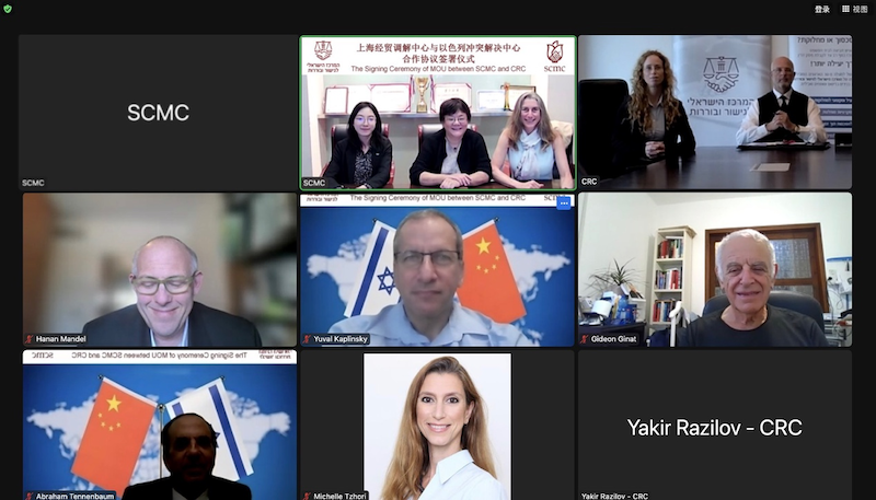 前以色列特拉维夫地区法院副院长吉迪恩·吉拉特(Gideon Ginat)、退休大法官亚伯拉罕·田南鲍姆(Abraham Tennenbaum)、前以色列司法部国际事务司司长瓦尔·卡普林斯基(Yuval Kaplinsky)、SCMC与CRC有关部门负责人在线见证仪式。