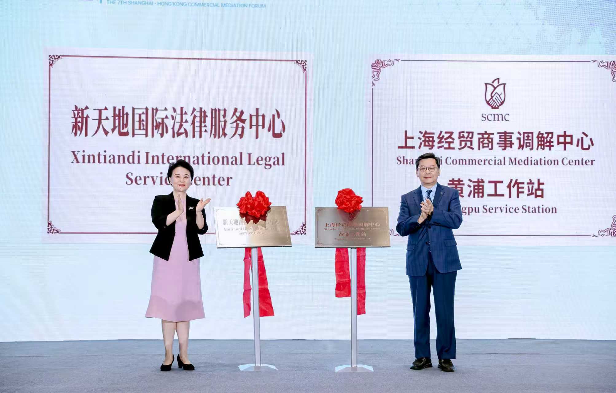 “上海经贸商事调解中心(黄浦)工作站”“新天地国际法律服务中心”揭牌仪式同期举行,上海现代服务业联合会会长、上海经贸商事调解中心理事长孙建平与中共中共黄浦区委副书记、区长徐惠丽共同揭牌,标志沪港商事调解服务实体化合作迈出关键一步。
