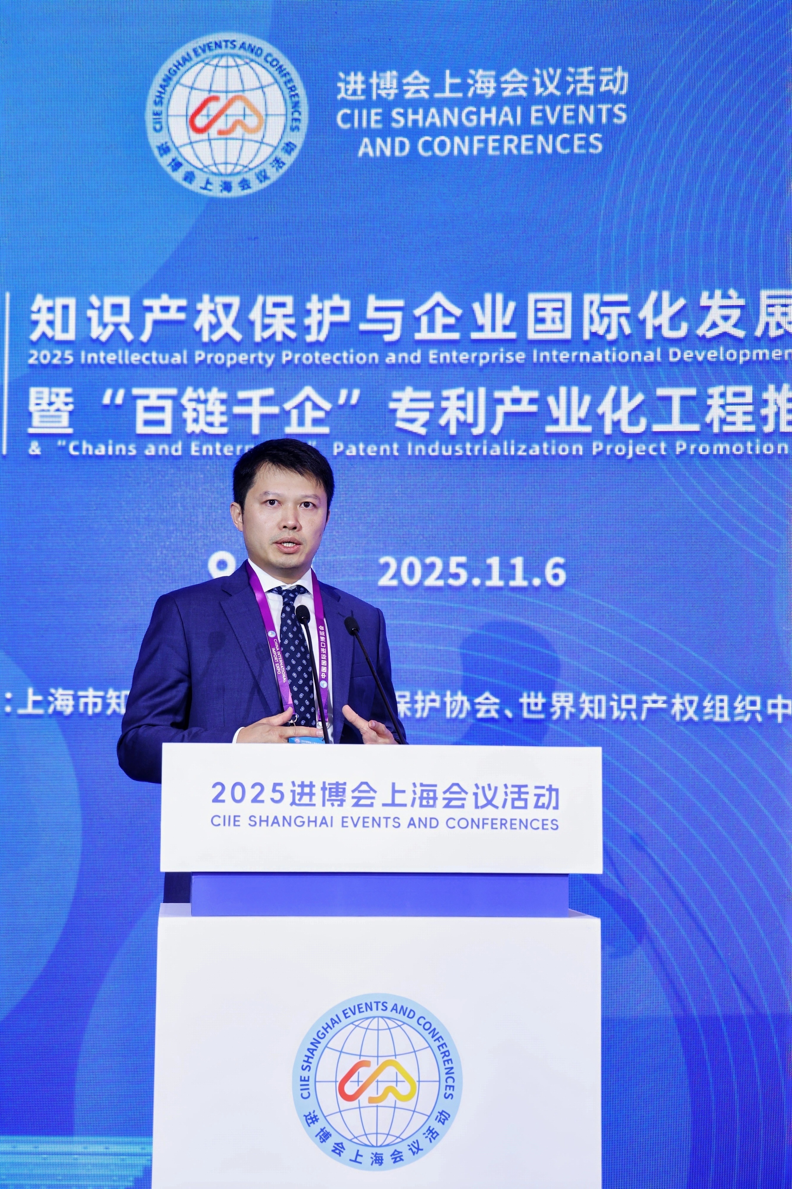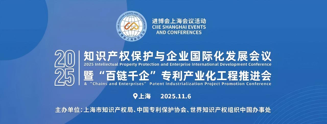 2025年11月6日,作为第八届中国国际进口博览会的配套现场活动,“知识产权保护与企业国际化发展会议暨‘百链千企’专利产业化工程推进会”在上海举行。会议由中国专利保护协会、上海市知识产权局、世界知识产权组织中国办事处联合主办,政府和产业界代表汇聚一堂,共论知识产权保护新趋势与企业国际化发展的时代课题。国家知识产权局党组成员、副局长芮文彪出席会议并致辞。